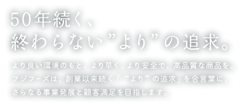 より良い環境のもと、より早く、より安全で、高品質な商品を。フジフーズは、創業以来続く「”より”の追求」を合言葉に、さらなる事業発展と顧客満足を目指します。
